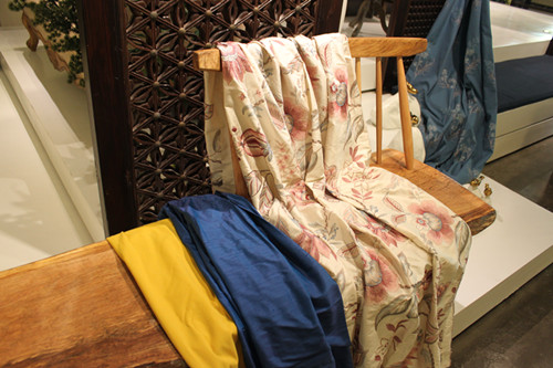 本次家纺展,杭州国达丝绸参展的主打新品依然追随自然、质朴、素雅的风格,在材质上还是延续国达丝绸的主打真丝系列。有100%纯桑蚕丝,也有真丝与棉、麻等其它天然材质混纺的新材料。与以往不同的是,在色彩选择上,国达丝绸通过更精准的客户定位来确定色系,花型也更偏清新与小资。