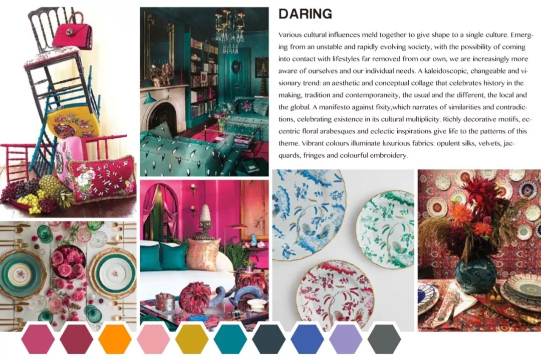 丰富的装饰图案,新奇的花卉蔓藤花纹和不拘一格的灵感,赋予了本主题图案的生命力。鲜艳的色彩映照着华丽的丝绸和天鹅绒,提花,流苏和彩色刺绣。